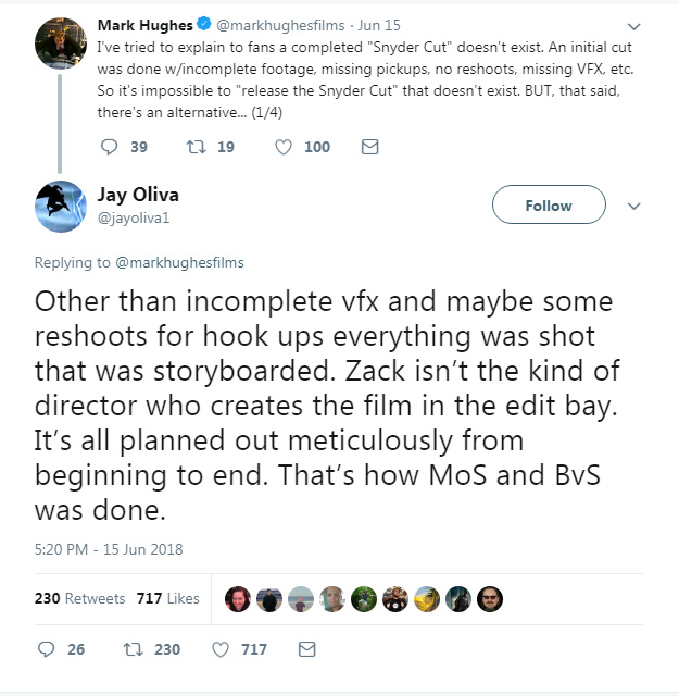 ওদিকে দিন পেরিয়ে মাস গেলো, মাস পেরিয়ে বছরও ঘুরতে চললো, ‘স্নাইডার-কাট’-এর আর দেখা নেই। ডিসি অনুরাগীরা যখন অধৈর্য, তখন কামান থেকে বেরিয়েছে গোলা। আর সেটা ফেটেছে ফোর্বস-এর বিশিষ্ট কামানিস্ট থুক্কু কলামিস্ট মার্ক হিউজ আর ড্রিমওয়ার্কস অ্যানিমেশনের নামকরা স্টোরিবোর্ড আর্টিস্ট জে অলিভা-র টুইটার কথোপকথনের জের ধরে।