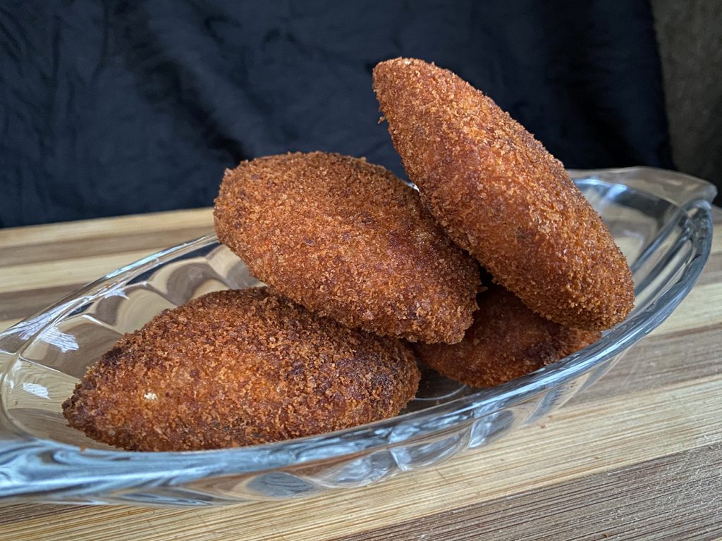 Make small rotis out of the dough. Add fillings in the roti and shape it into half-moons. Douse the moon pies into the whisked egg (salted) and cover them with bread crumbs. Put a double coating of bread crumbs if necessary. Once the prepping is done, put the moon pies into the refrigerator for thirty to an hour.