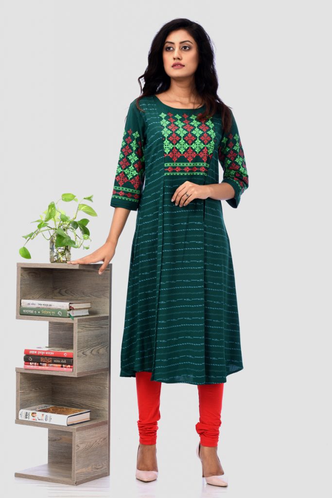স্ক্রিন প্রিন্ট, ব্লক প্রিন্ট, টাই ডাই ও হাতের কাজের মাধ্যমে পোশাকে ডিজাইন ফুটিয়ে তোলা হয়েছে।