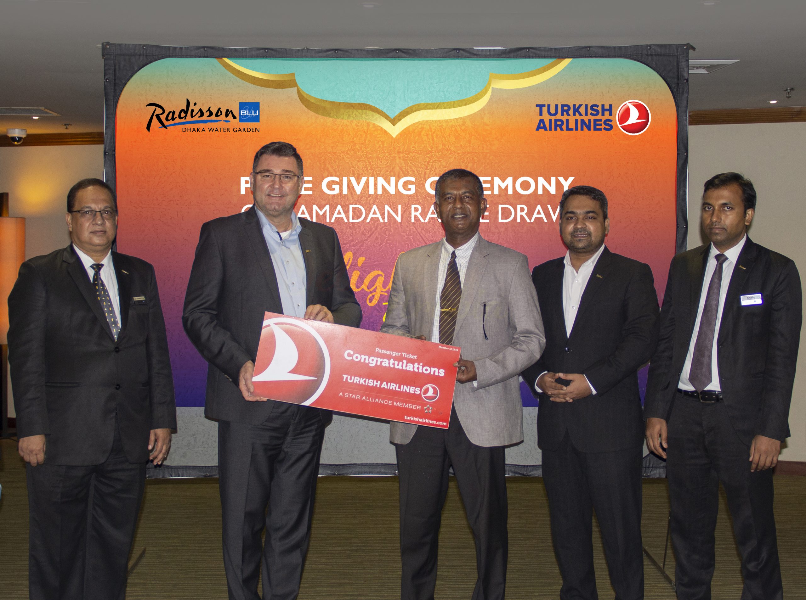 Radisson Blu Dhaka’s Cluster General Manager Mr. Alexander Haeusler along with members of Radisson Blu Dhaka’s management team presented the lucky first prize winner of the Ramadan Iftar Raffle Draw to Col. Sayed Mohammad Asaduzzaman, with a Dhaka-Istanbul-Dhaka couple flight ticket powered by Turkish Airlines.