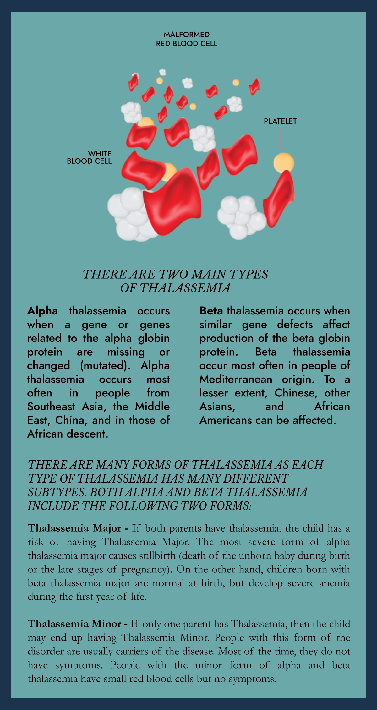 One such disorder plaguing the lives of many is thalassemia. Thalassemia is a blood disorder inherited through genetics where the body makes an abnormal form or an inadequate amount of hemoglobin that results in large numbers of red blood cells being destroyed, which in turn leads to anemia. Hemoglobin is made of two proteins, Alpha globin and Beta globin. Thalassemia occurs when there is a defect in the genes that help control production of one of these proteins.