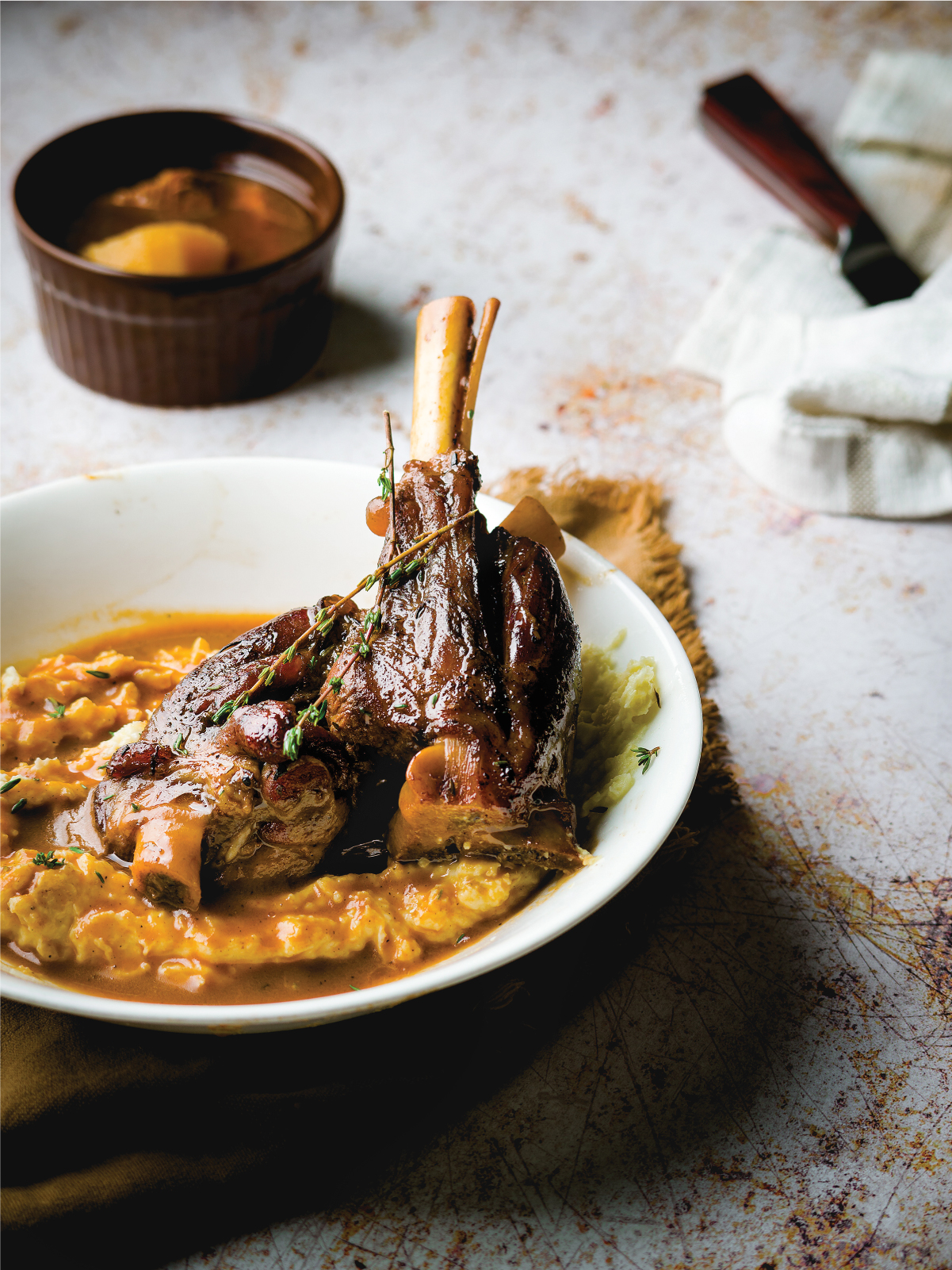 6. After a total of 3 hours in the oven, the shanks should fall off the bone, tender and ready to eat. At this point the gravy can be served as is, or it can be transferred to a blender and passed through a strainer for a rich, smooth gravy.