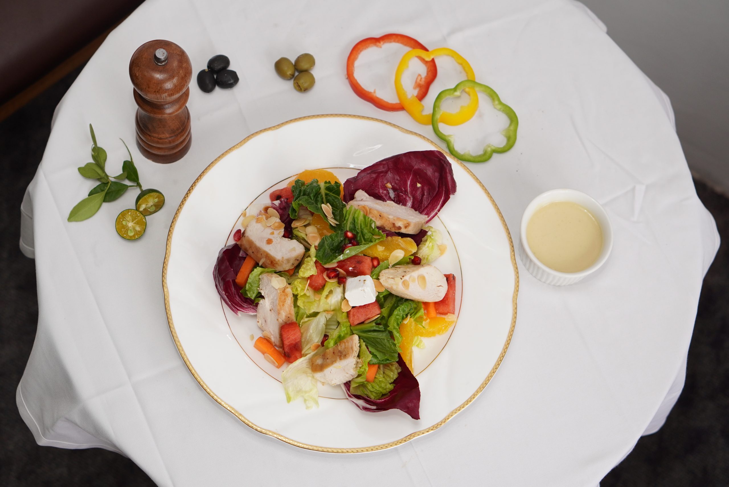 Ingredients: Lettuce, grilled chicken, carrot, orange, watermelon, toasted almond flakes, lemon vinaigrette.
