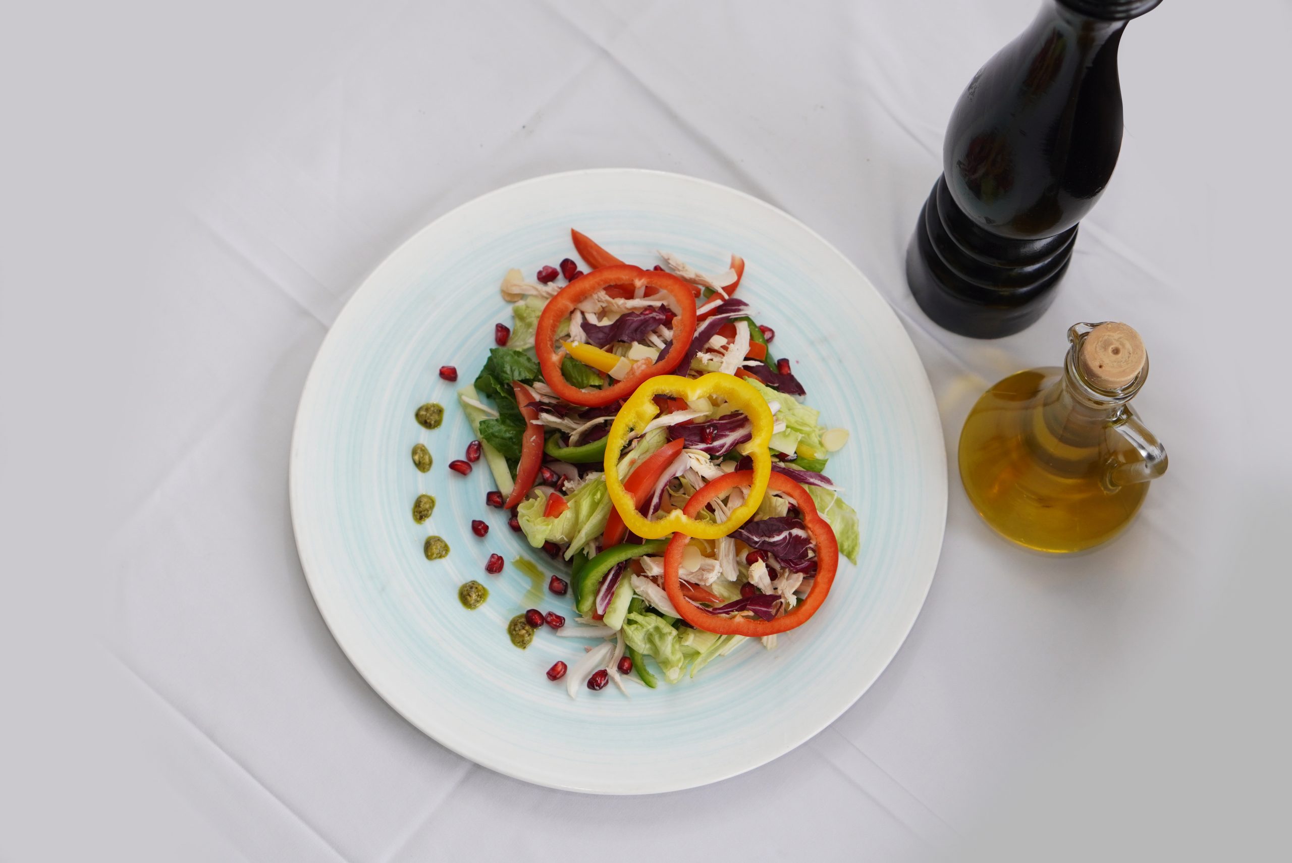 Ingredients: Boiled chicken, lettuce, shredded cucumber, tomato, colourful bell peppers, sliced onion, olive, seasoning and lemon olive dressing.