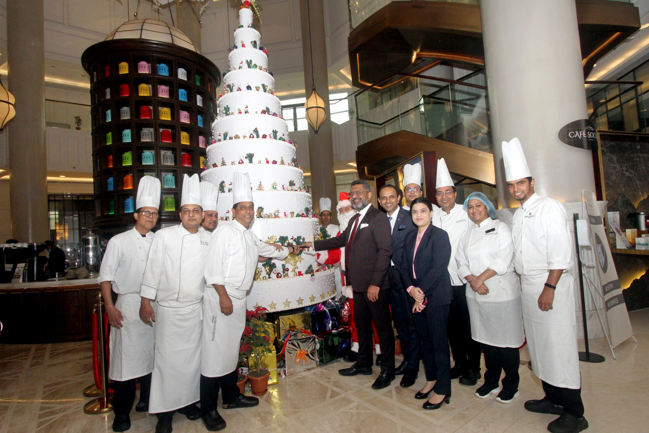 Christmas is all about the sparkle of happiness and joy. Christmas has always been an undividable part of our culture. During this festive time InterContinental Dhaka puts colourful décor to set the right mood for the celebration. InterContinental Dhaka has decorated its premises with delightful decorations to portray the season of happiness. The hotel has added a new appealing and eye-catching Christmas tree cake this year. This Christmas cake is tree-shaped and 16 feet in height weight 1800 pounds. It took 15 days to prepare this cake by the entire pastry and bakery team traditional Plum flavoured cake with Christmas decorations.