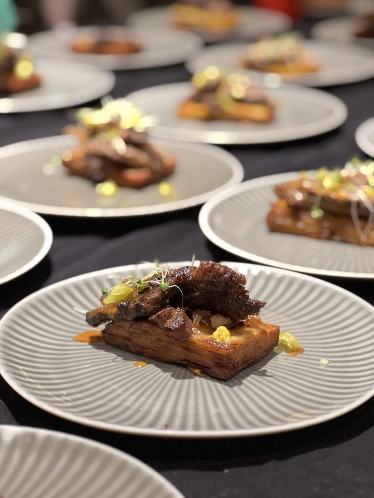A version of the SW dish that formed the brand image for the event, the Snowskin mooncake had a satisfyingly chewy exterior. As you take a bite, the ‘moon’ reveals an inky Black Sesame Bhorta with a rich, koji-ghee cured Egg Yolk glistening in the center. Spicy, salty, and sweet, the ‘Purnima’ celebrated the full moon on the night of the pop-up dinner. The first main course of fresh steamed Surma fish, sat against bright pink jewels of Jambura marinated in local Dragon Fruit. Its accompanying sauce was made from 3-year Kathal (Jackfruit) Miso and Tahini. A take on Sylhet’s famous Shatkora Beef, the second main featured slow-roasted Dry Aged Prime Rib with a luscious Shatkora just reduced for 12-hours.