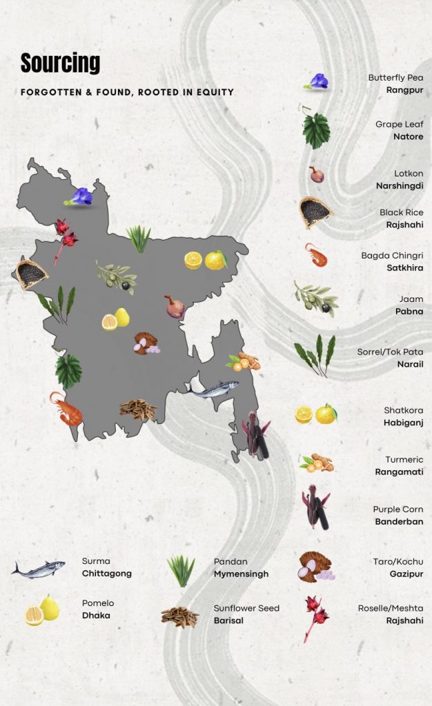 To present the journey of cuisines in Bengal, Chef Sameera Wadood and Pastryarchy developed an ingredient-forward menu, all locally sourced. It consisted of an 8-course tasting menu, with a surprise mignardise course featuring Lotkon Macarons, accompanied by an in-house SW Ginger Ale. The guests walked through the glass doors of the greenhouse, into a visual ‘Ingredient Installation’ that allowed them to immerse themselves into the chefs’ personal journey. With the menu, guests also received a map of Bangladesh, featuring Passionfruit from Cox’s Bazar to Black Rice from Rajshahi.