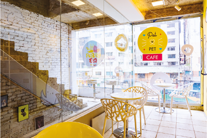 Housed within glass walls, a partitioned zone provides both entertainment and privacy, ensuring that the pets have a comfortable spot to relax and play. As a fun place for both people and animals, Pat a Pet Cafe also carries delicious treats for their cats and furry guests, including custom cakes.