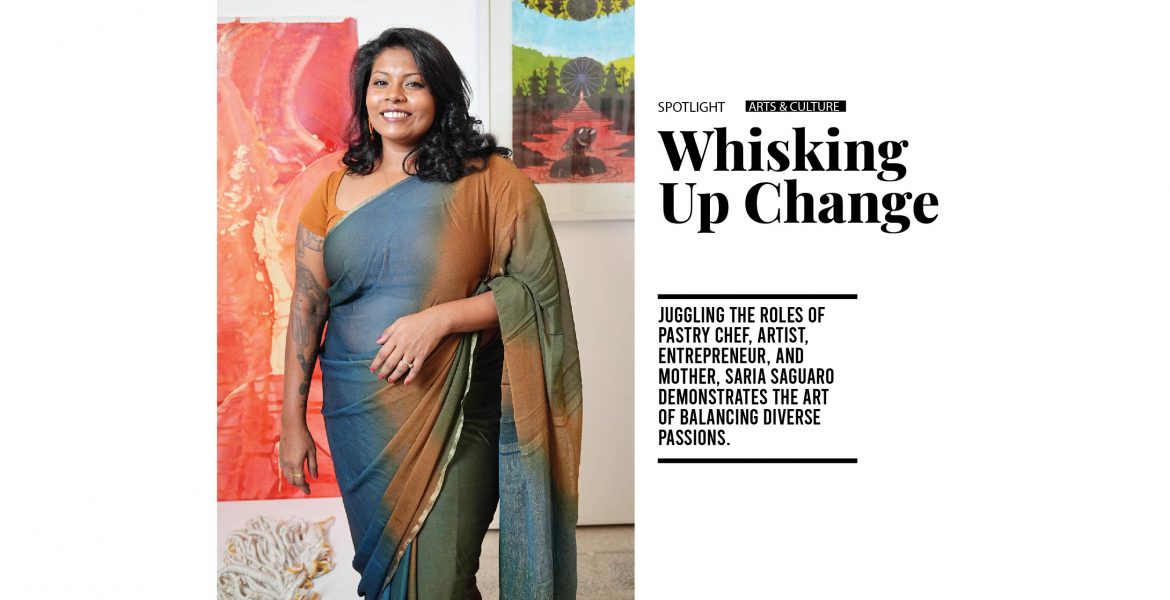 Saria seamlessly blends her artistic expression into her culinary creations, drawing parallels between patisserie and painting. She meticulously considers colour, palette, and contrast to create visually stunning cakes. “The skills acquired through each of my crafts are interchangeable, with my painting experience enhancing my ability to create edible art on cakes and my fondant work contributing to my sculpting abilities,” she shares.